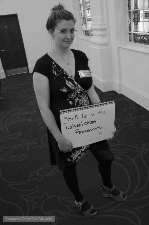 2116This is Eliza, who says in her audio clip that: I was told this just after Id had my first son. Ive a bad back, Ive got a curved spine. When I had him he got stuck and I dislocated my pelvis. They told me not to have any more children, because Id be in a wheelchair for my pregnancy.