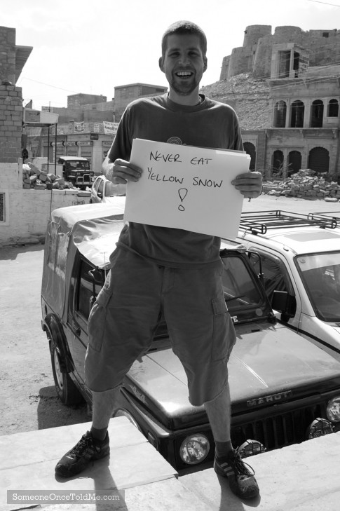 016A plumber with a regular giggle, his left foot went over the edge moments before this picture was taken in Jaisalmer, India, during the Holi festival, but he managed to keep his balance.